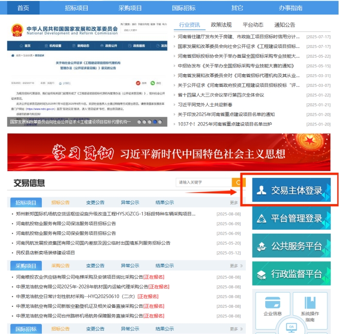 登录河南豫信公共资源交易平台网站(http://www.hnyxggzy.com/),点击【交易主体登录】按钮进入交易主体系统登录页面。