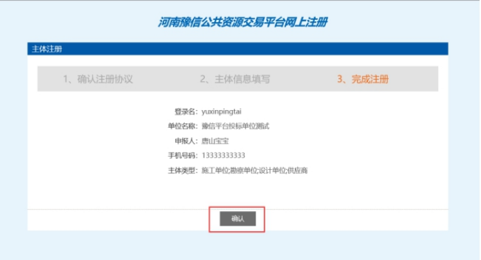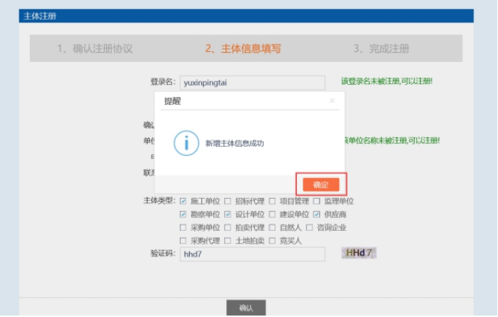 2.4 输入验证码点击 “ 确认 ”,提示“新增主体信息成功”。然后点击“确定”完成单位基础信息注册。