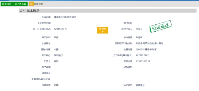 2.8 、 豫信平台管理工作人员会 对 交易主体 填报的基本信息进行 网上验证 ,请关注 交易主体 信息库基本 信息展示页面,查看 验证通 过情况。 (出现待验证状态,请等待交易中心工作人员验证)验证通过后,系统页面会出现“验证通过”标记, 交易主体 即可进行网上业务操作。