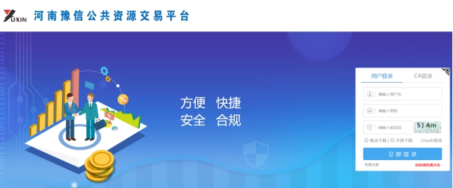 使用CA数字证书登录系统前,请确保驱动已正常安装完成、CA证书已经和单位进行绑定(激活),如需要自行绑定激活,请参考豫信平台网站的“系统操作指南”模块的“CA在线自助激活手册”进行相关操作。